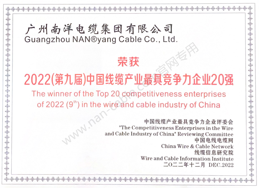 • 2022年度中國線纜行業(yè)最具競爭力企業(yè)20強(qiáng)證書