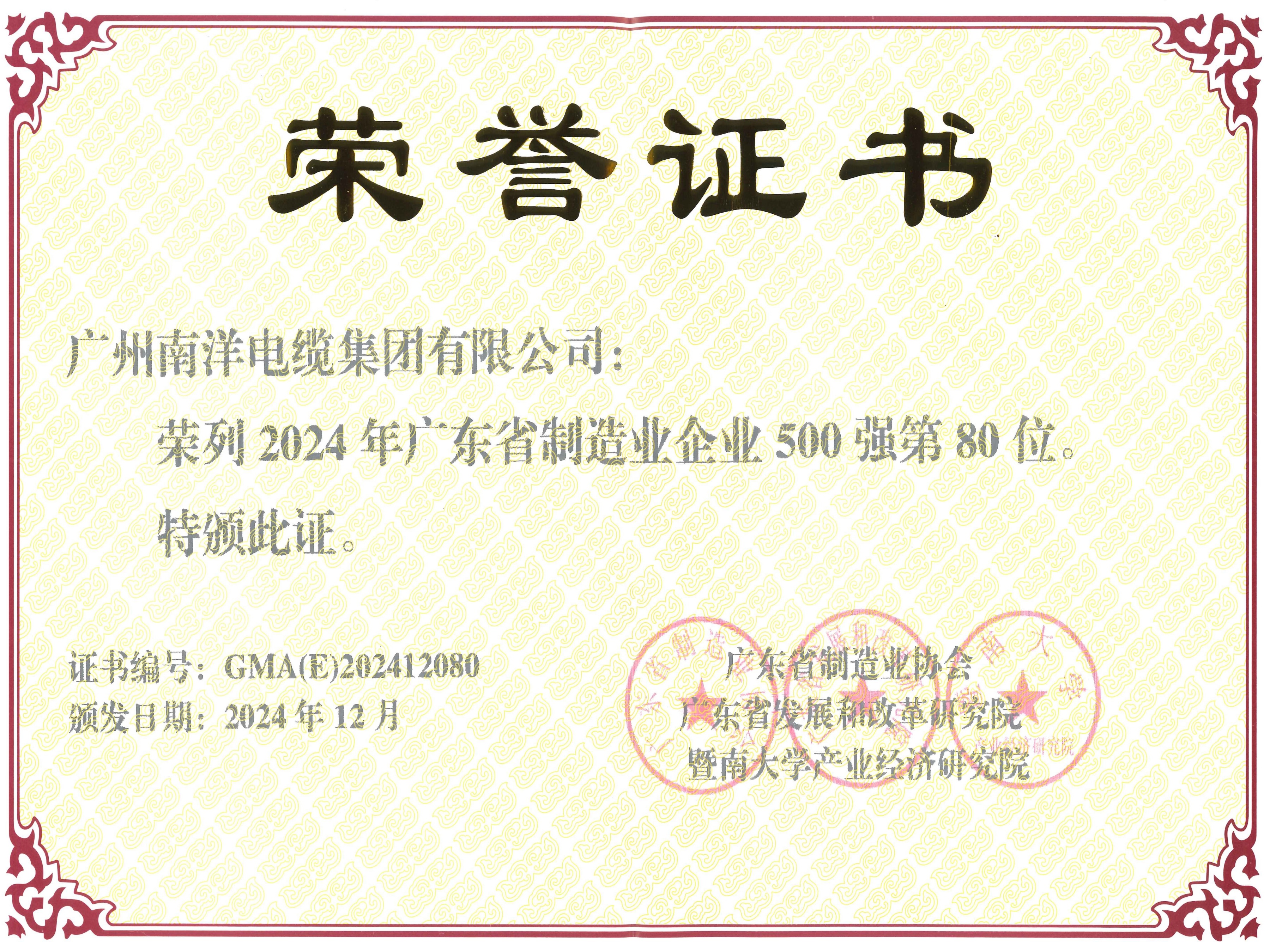 • 2024年廣東省制造業(yè)企業(yè)500強(qiáng)第80位證書