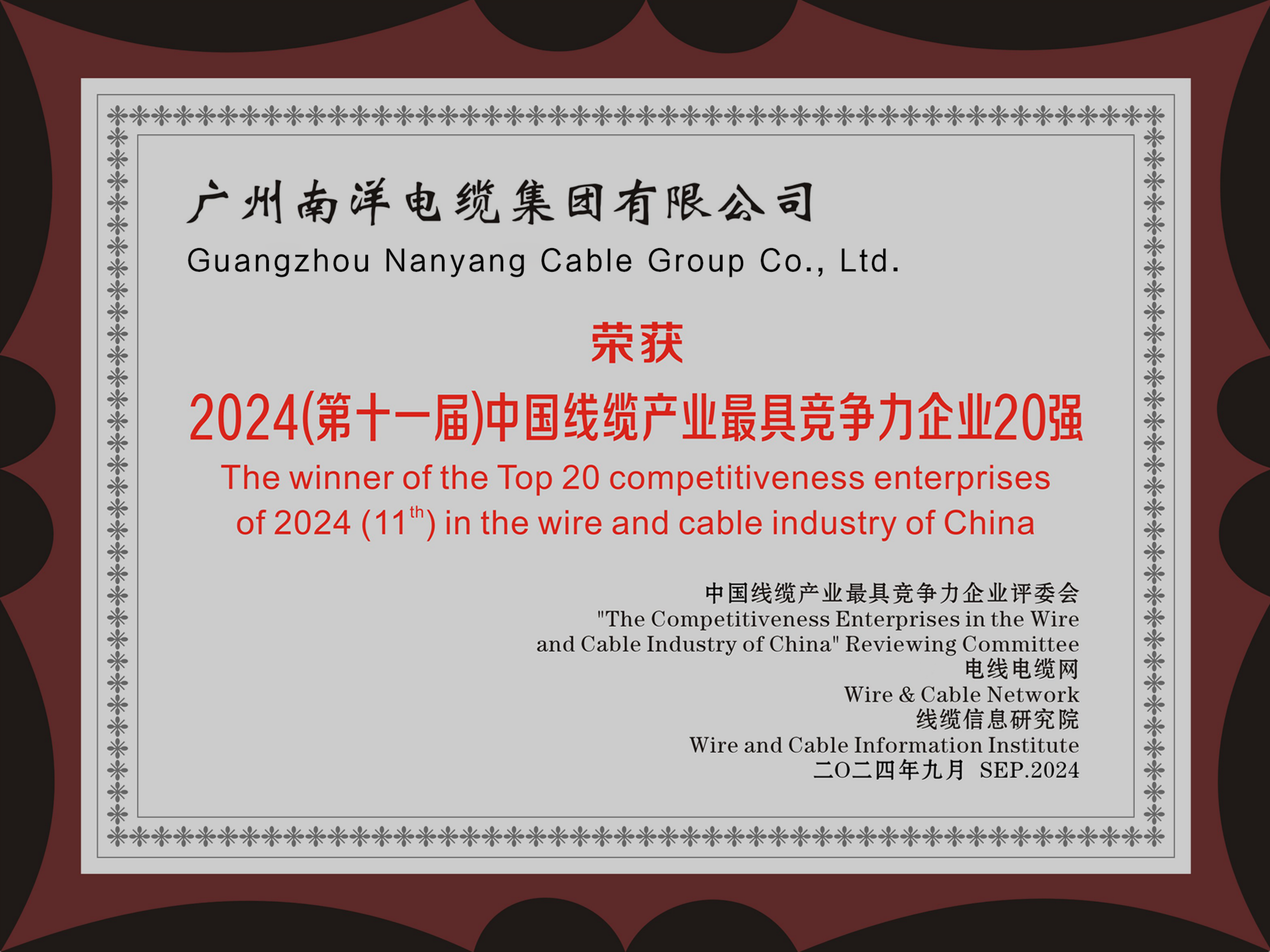 • 2024年度中國線纜行業(yè)最具競爭力企業(yè)20強(qiáng)證書